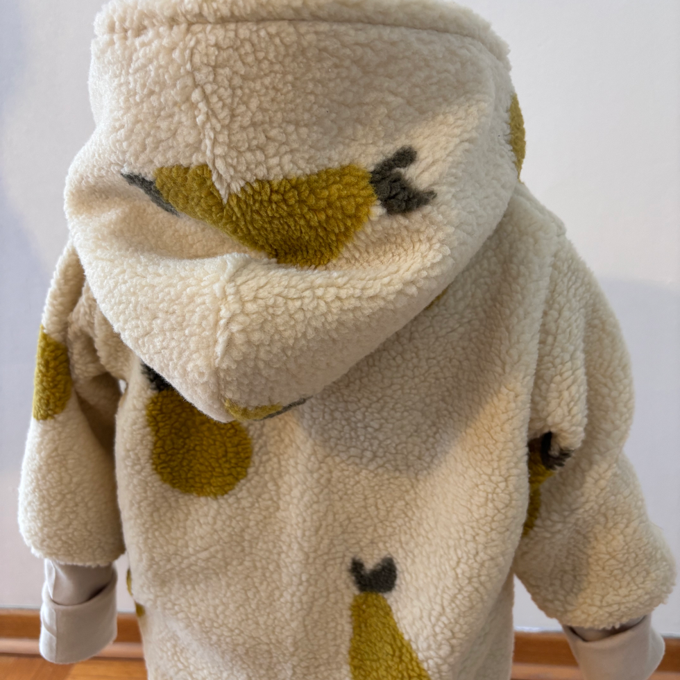 Diese Teddy-Jacke besteht aus kuschligem Teddyfleece und hat ganz niedliche Birnen als Motiv. Sie wird beigem Baumwolljersey gefüttert. Sie ist der perfekte Begleiter für eure Mäuse im Frühling. Die Jacke wird mit einem Reissverschluss geschlossen. Sie haben eine großzügige Kapuze.