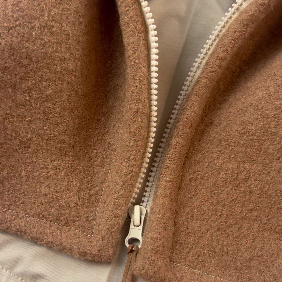 Die Walkjacken in camel nähen wir aus bester Schurwolle, gefüttert werden sie mit hochwertigem beigem Baumwolljersey. Weiche Baumwollbündchen werden an den Armen in beige angebracht. Diese werden zu Anfang erst einmal umgeschlagen. Somit passt die Jacke schön lange. Die Walkjacken werden mit einem Reissverschluss geschlossen und haben eine großzügige Kapuze.